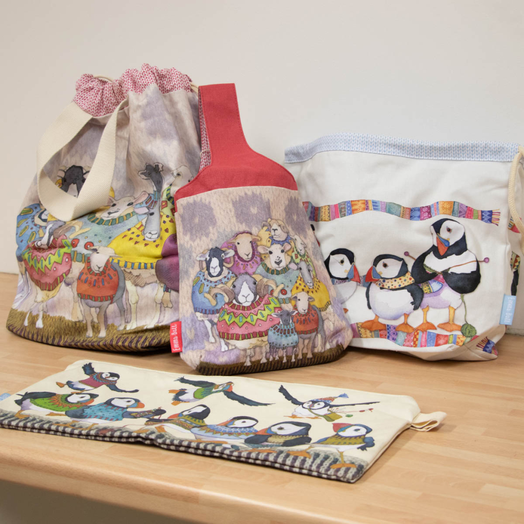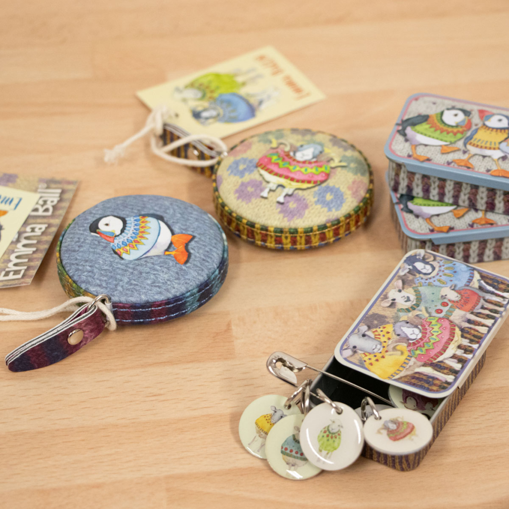 We’re delighted to now be stocking a selection of Emma Ball products – different sized project bags (including a nifty wrist bag, perfect for knitting-on-the-go), sliding notion tins with stitch markers inside, and tape measures!