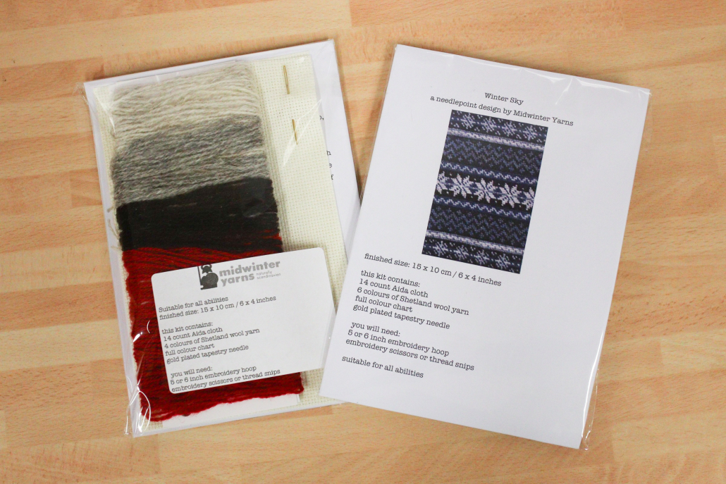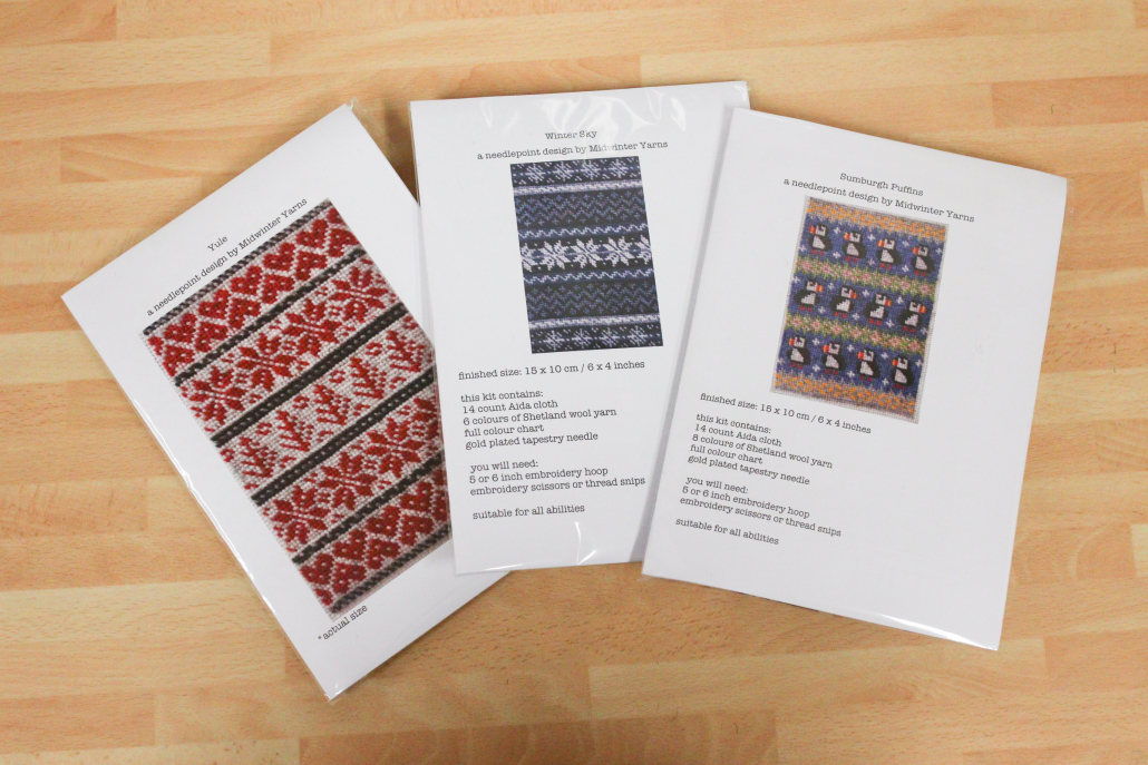 New in, and something a bit different – we have a selection of lovely needlepoint kits in from Midwinter Yarns in Shetland. These feature designs inspired by Fair Isle knitting, and are worked in Shetland wool (included in the kit).